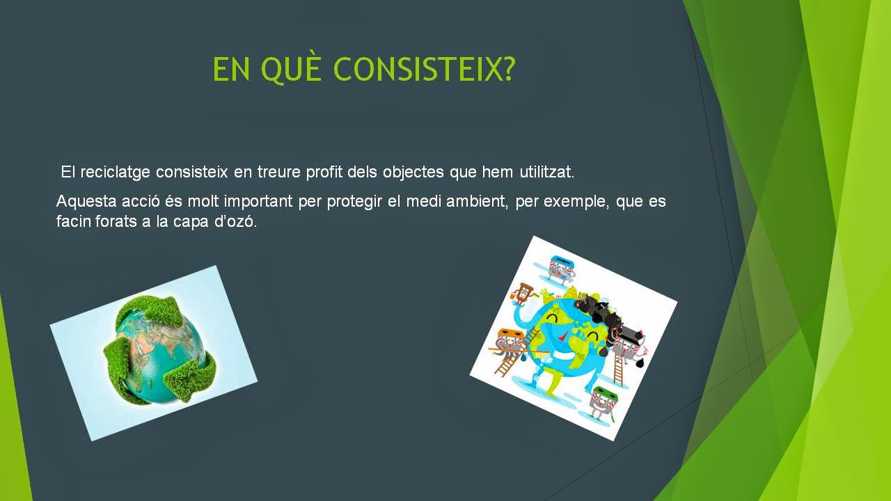 Hem fet un powerpoint sobre tot el que hem après en relació al reciclatge, com per exemple: Què és?, Com es reutilitza?. Els diferents contenidors que hi ha etc.